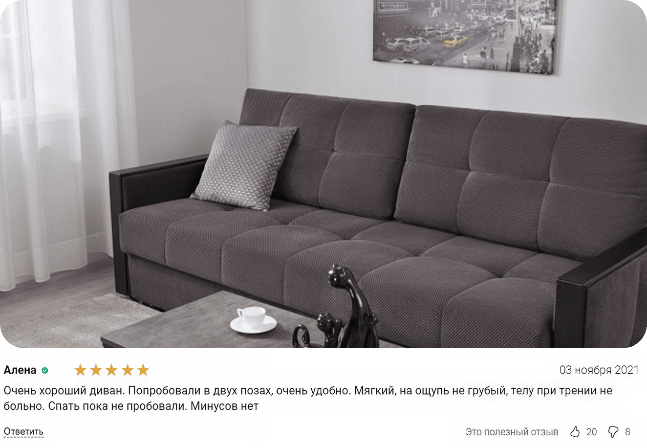 Мы поможем подобрать модель, подберем ткань и модули, организуем доставку, контролируем весь процесс от производства до вашего дома и решим любые вопросы, если что-то пойдет не так. Нам можно доверять